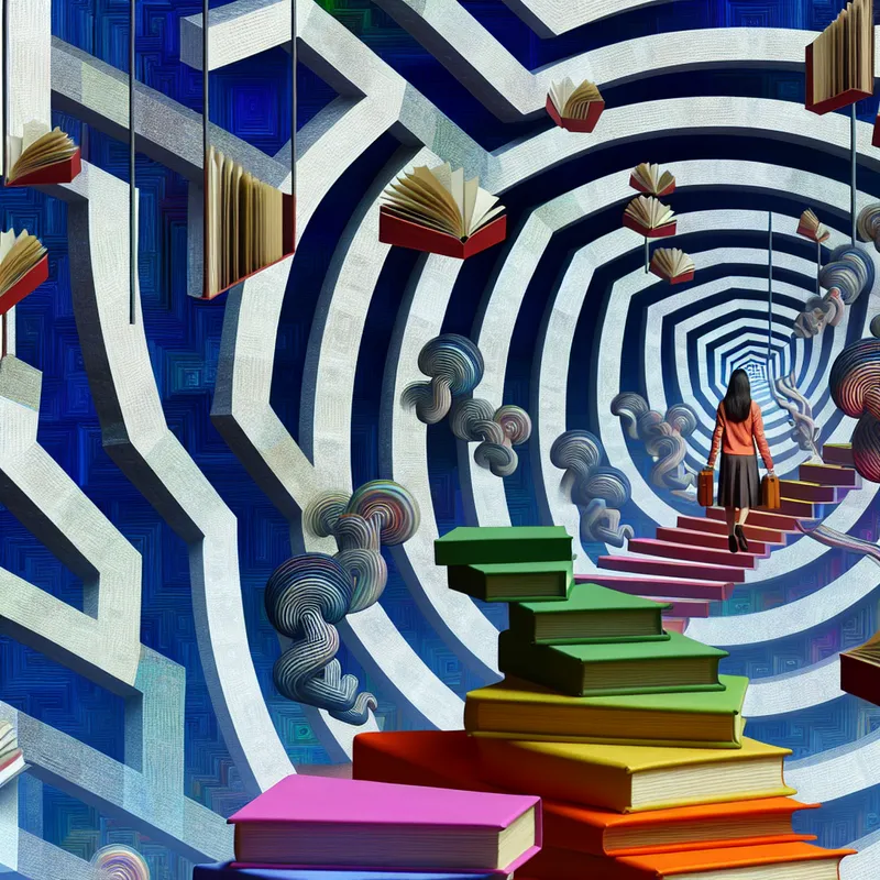 Een surrealistische en geometrisch precieze afbeelding van een persoon in een doolhof van trappen en boeken, wat het verwerven van kennis symboliseert.