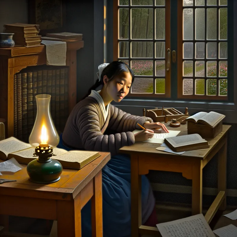 Een jonge, geconcentreerde werknemer zit aan een bureau in een zacht verlichte kamer, omringd door papieren en boeken, met een gloeiende olielamp.