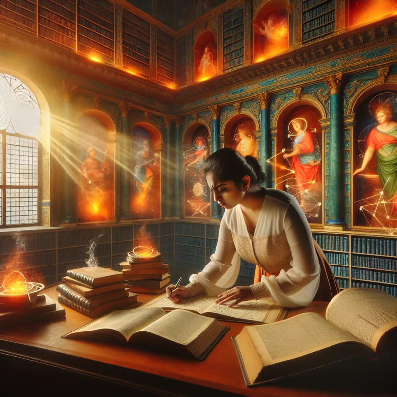 Een jonge vrouwelijke onderzoeker verzamelt gegevens in een goed verlichte studie, omringd door boeken en scrollen, terwijl warme gouden lichtstralen naar binnen vallen.