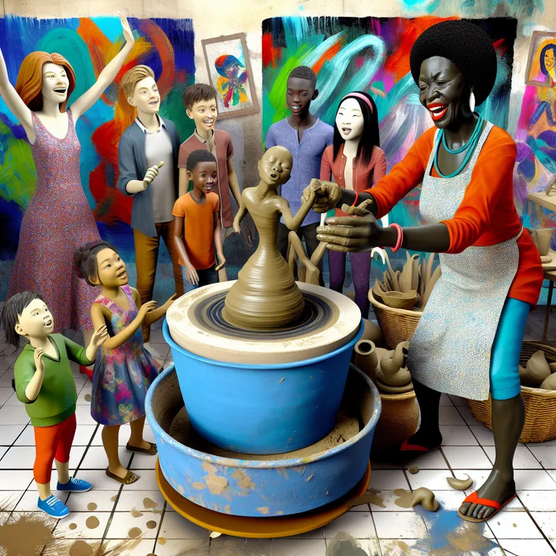 Persoon die met klei een abstracte sculptuur vormt op een draaischijf, met kleurrijke achtergrond en kinderen die toekijken.
