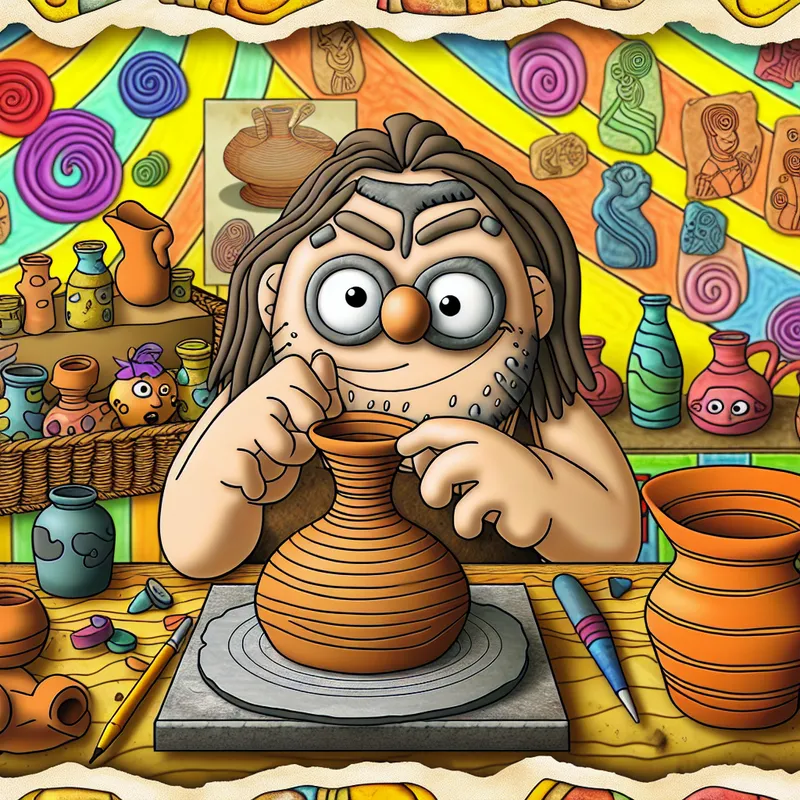 Een kleurige cartoonafbeelding van een personage dat geconcentreerd een klei-vaas vormt in een creatief atelier.