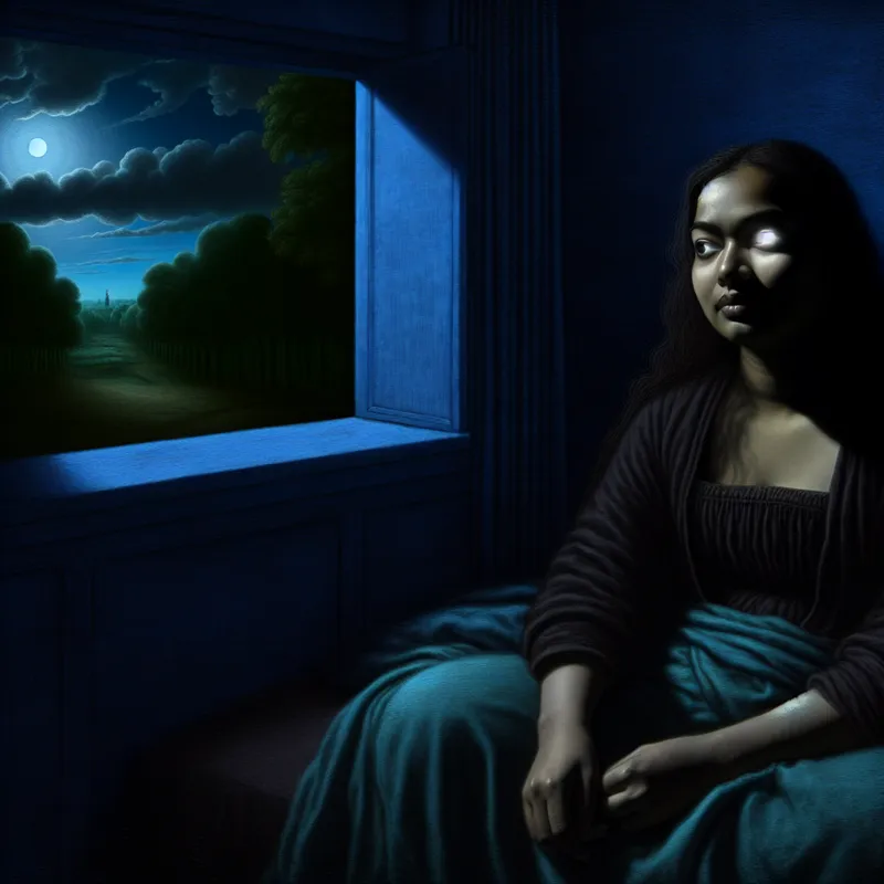 Een vrouw die bij haar raam zit, verlicht door maanlicht, terwijl ze naar de nachtelijke lucht kijkt.