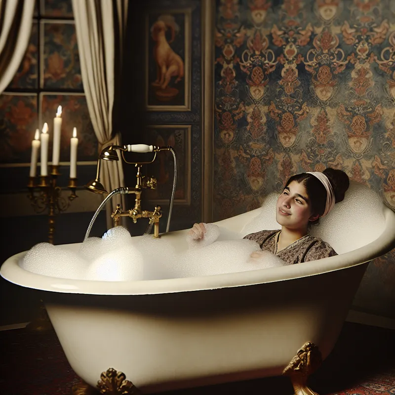 Een jonge vrouw ontspant in een grote badkuip vol met bubbels, omgeven door kaarslicht