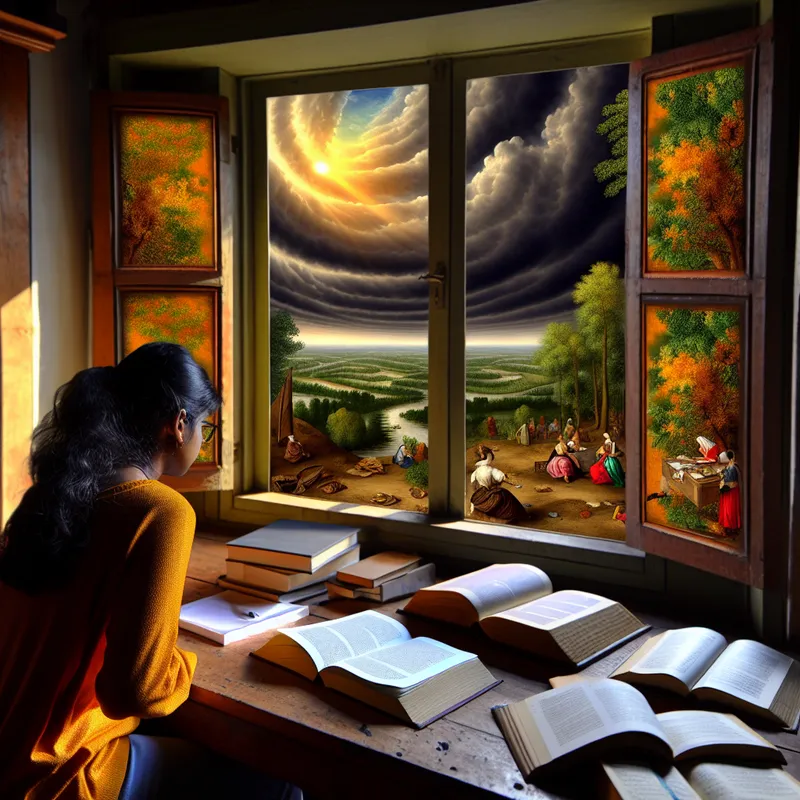 Jonge vrouw die aan een houten bureau zit in een zonnige kamer, omringd door open boeken en studiematerialen, met een prachtig landschap zichtbaar buiten het raam.