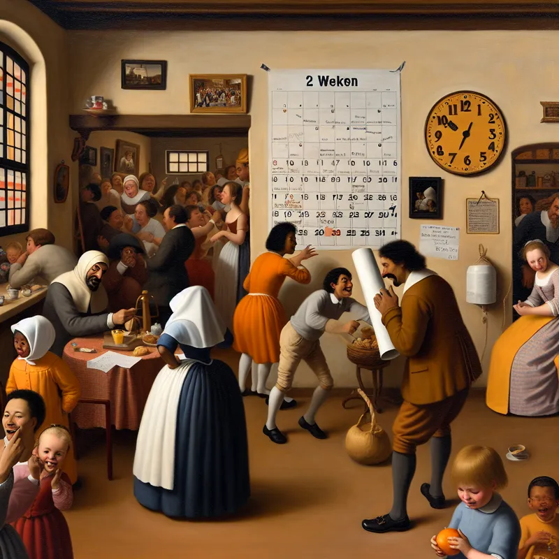 Een levendige en humoristische scene met mensen die zich in een drukke kamer bezig houden, een man kijkt bezorgd naar een kalender met de tekst '2 weken'.