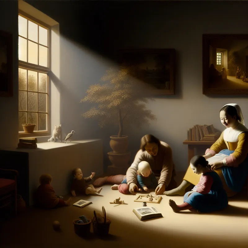 Gezellige woonkamer met gezin in Vermeer-stijl