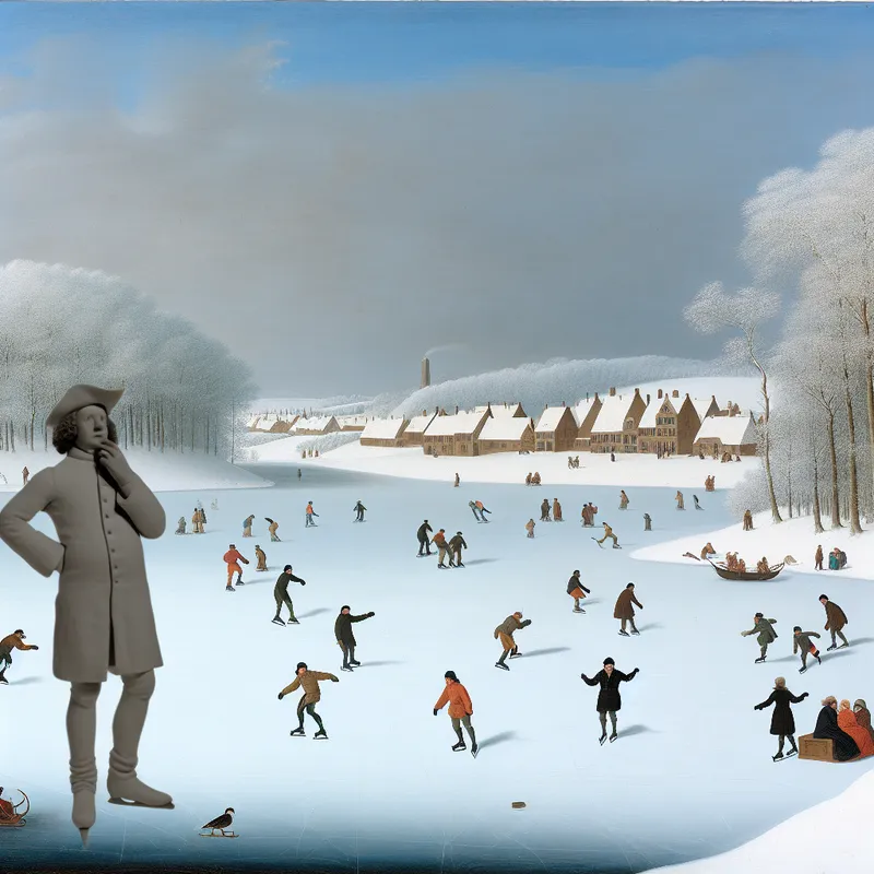 winters tafereel op bevroren meer met figuren die schaatsen en een persoon met aarzelende houding