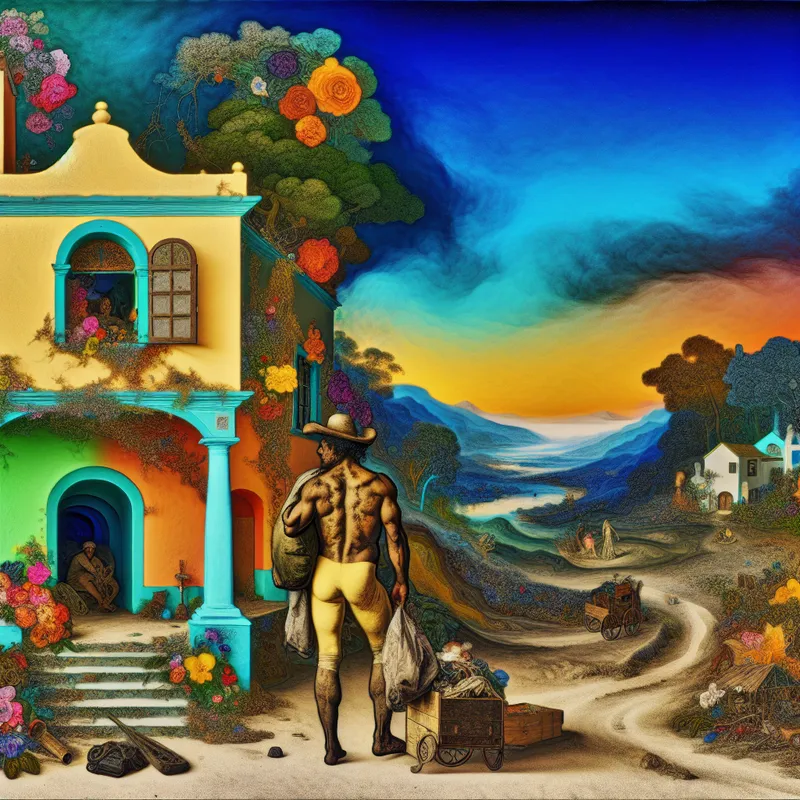 Een reiziger in een weelderige Barokke setting staand bij de drempel van een mooi huis, met een nostalgische blik.