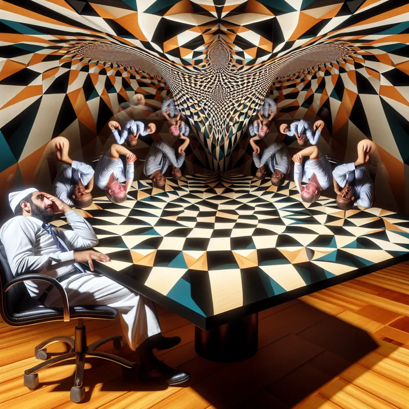 Een man zit aan een vervormde conferentietafel, omgeven door geometrische patronen en reflecties van gezichten in wanhoop, expres de druk van werk en frustratie.