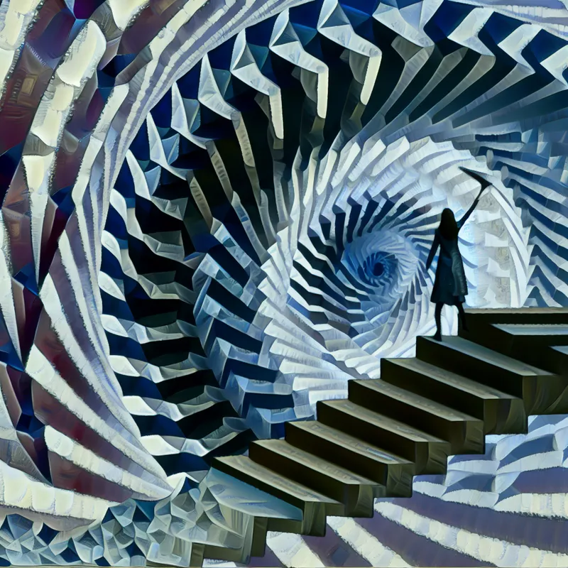 Surrealistische geometrische afbeelding van een persoon op de rand van een spiraaltrap, die in de afgrond kijkt en worstelt met emoties.