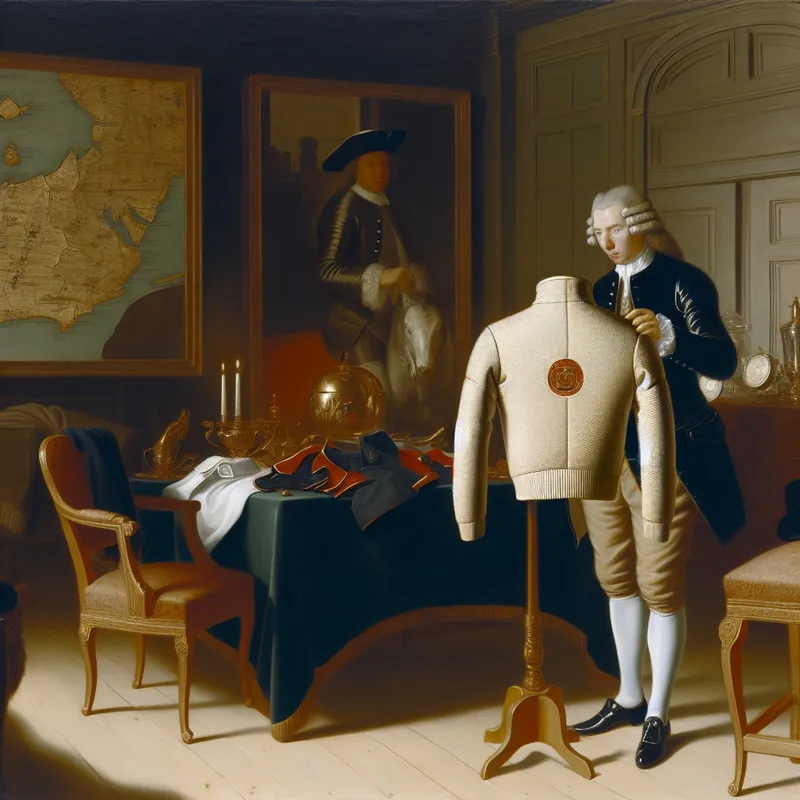 17e-eeuwse Nederlandse koopman bekijkt luxe Nike sportjas in elegant interieur met Europese kaart op de achtergrond
