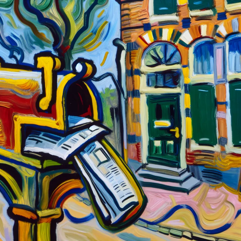 Abstract expressionistisch schilderij van een Nederlandse huisgevel met een opvallende brievenbus waar een krant uitsteekt, geschilderd in levendige kleuren en dynamische penseelstreken