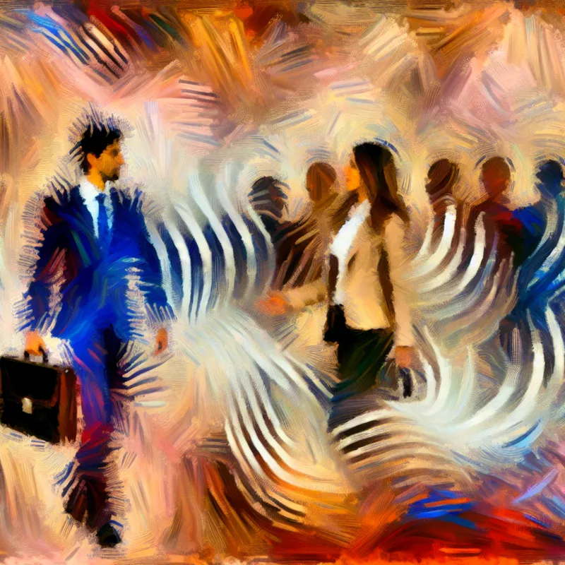 Abstract expressionistisch schilderij van een echtpaar dat een echtgenoot voorstelt aan collega's, met dynamische penseelstreken en levendige kleuren