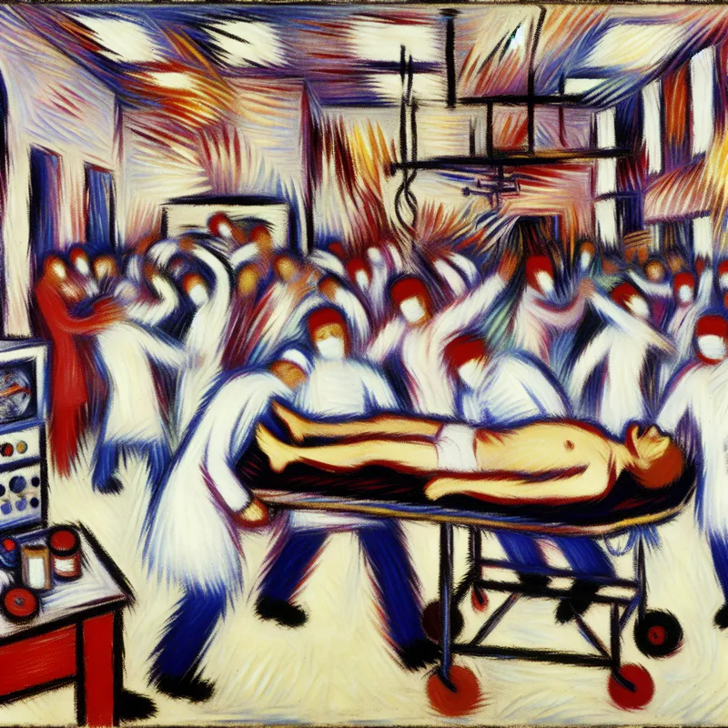 Abstract expressionistische weergave van een chaotische spoedeisende hulp in een ziekenhuis, met een patiënt op een brancard en druk bezig medisch personeel in felle kleuren