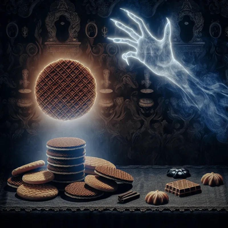 Symbolische voorstelling van een favoriet object, een gloeiende stroopwafel op een voetstuk omringd door donkere koekjes, met een spookachtige hand die ernaar reikt in een gotische stijl