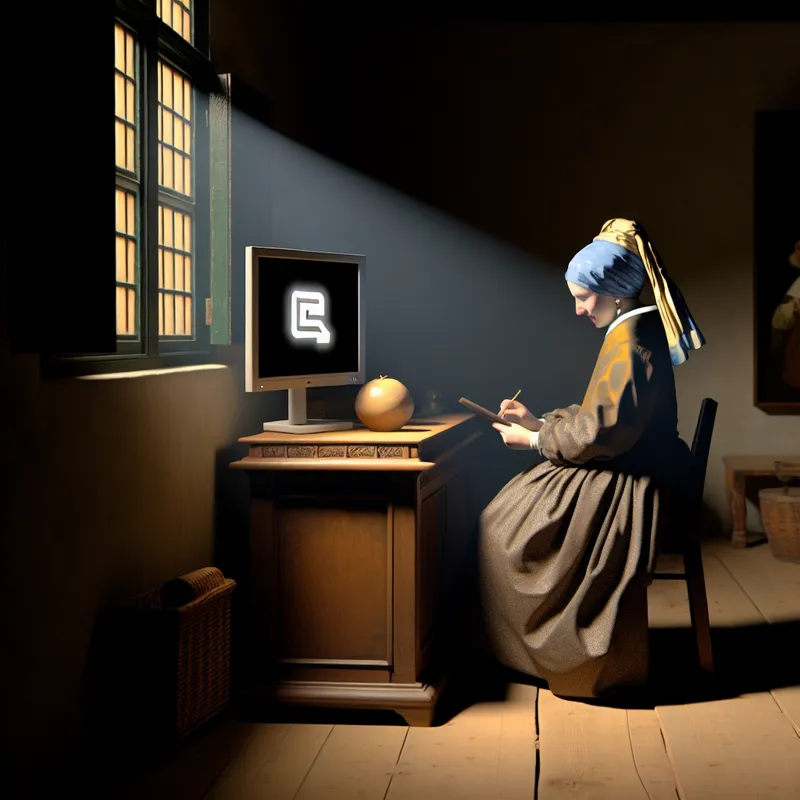 17e-eeuws Nederlands interieur met persoon achter houten bureau die naar een gloeiend computerscherm kijkt met een digitaal bestand icoon, Vermeer-stijl