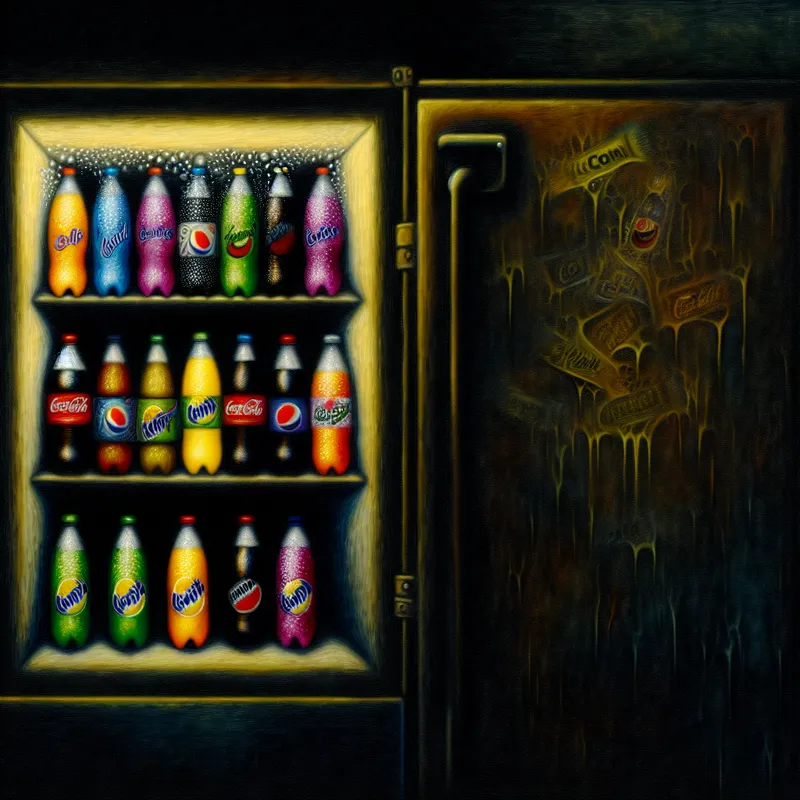 Donker café met geopende koelkast vol glinsterende frisdranken zoals cola, sinas en citroenlimonade, druppels condens benadrukken de verfrissende kou