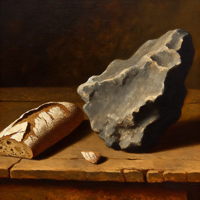 Stilleven schilderij in de stijl van Frans Hals met een harde steen en een hard geworden brood op een houten tafel, ter illustratie van het begrip 'hard' in de Nederlandse taal