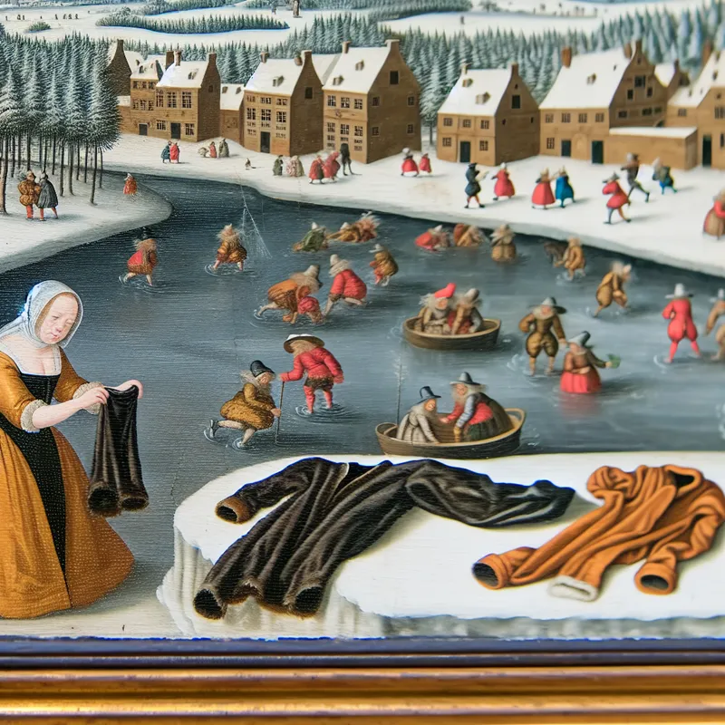 Gedetailleerde wintertafereel met persoon die natte kleren verwisselt voor droge kleding op bevroren kanaal, illustratie van het woord 'kleren'