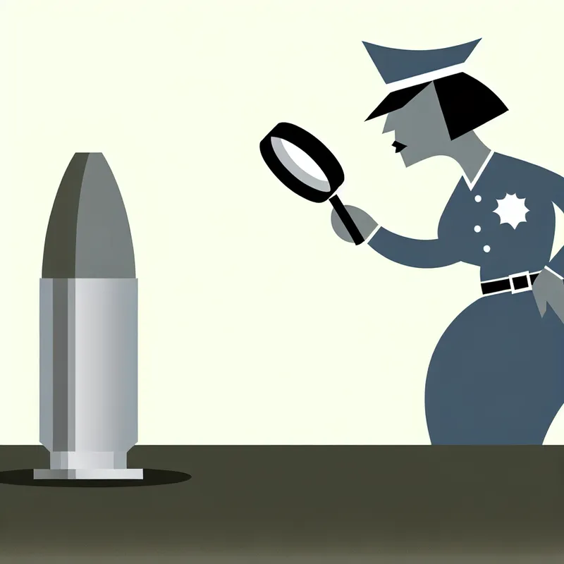 Minimalistische illustratie van een politieonderzoek met een glanzende kogel op de grond en een agent met vergrootglas