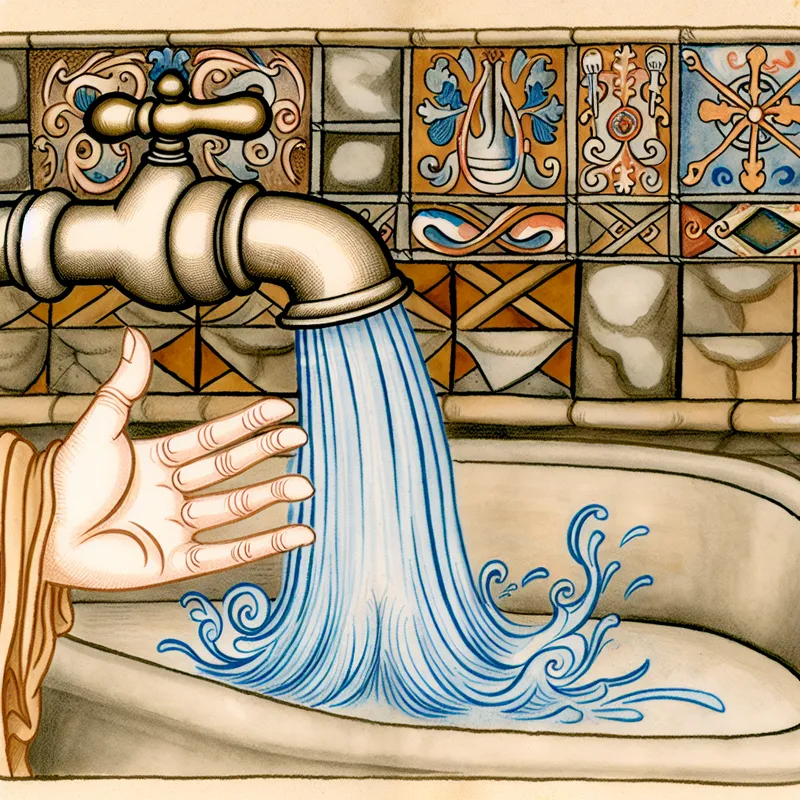 Cartoonkeuken met expressieve kraan waar water uit stroomt en een hand die de kraan dichtdraait