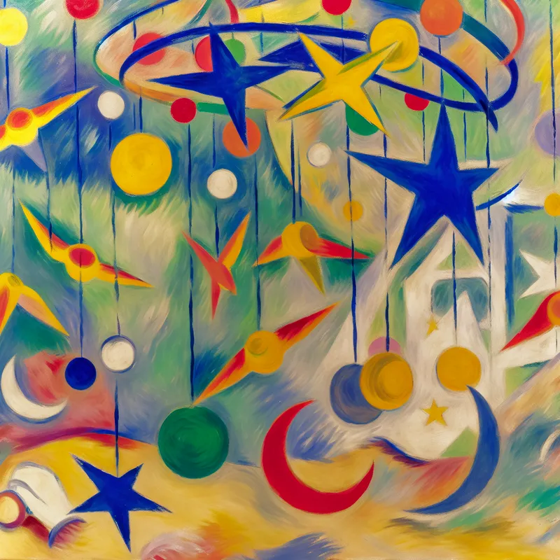 Kleurrijke mobiel met abstracte sterren en manen in de speelse stijl van Karel Appel, zwevend in een kinderkamer of kunstinstallatie
