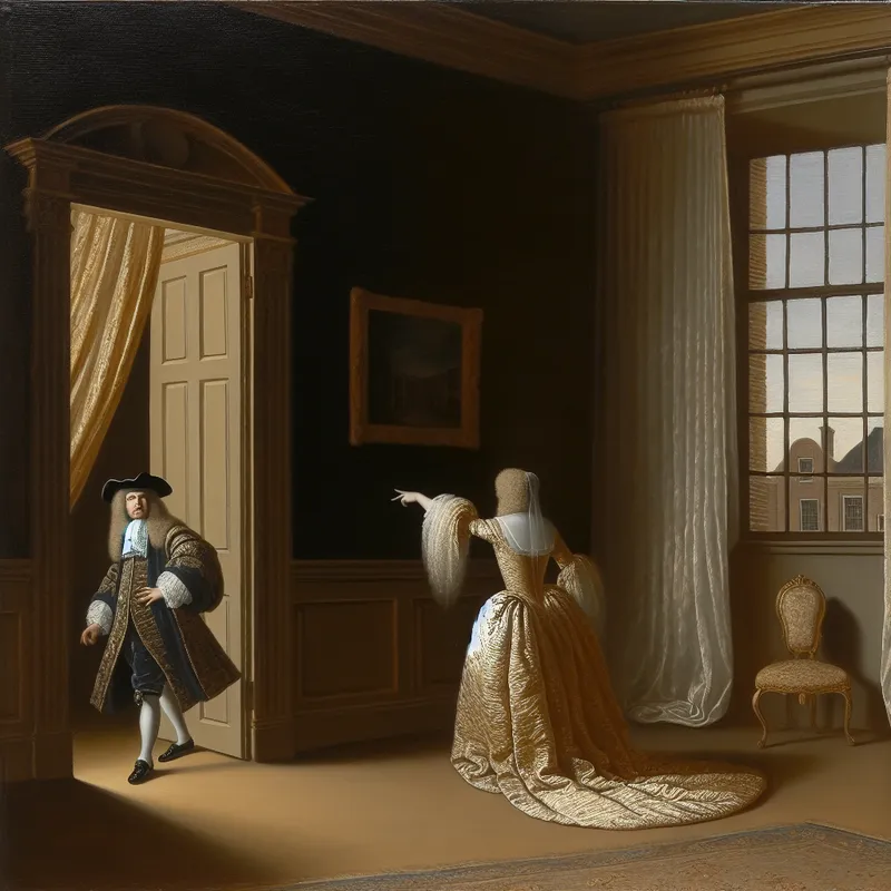17e-eeuws schilderij van een elegante persoon in luxe kleding die richting een open deur wijst in een verfijnd Hollands interieur