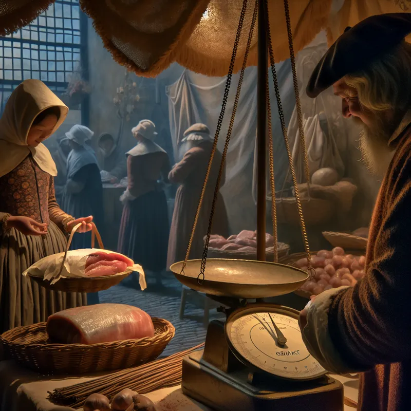 17e-eeuwse Nederlandse marktscène met een elegante klant die een pakket gehakt van 1 pond koopt bij een slager, gewogen op een koperen weegschaal