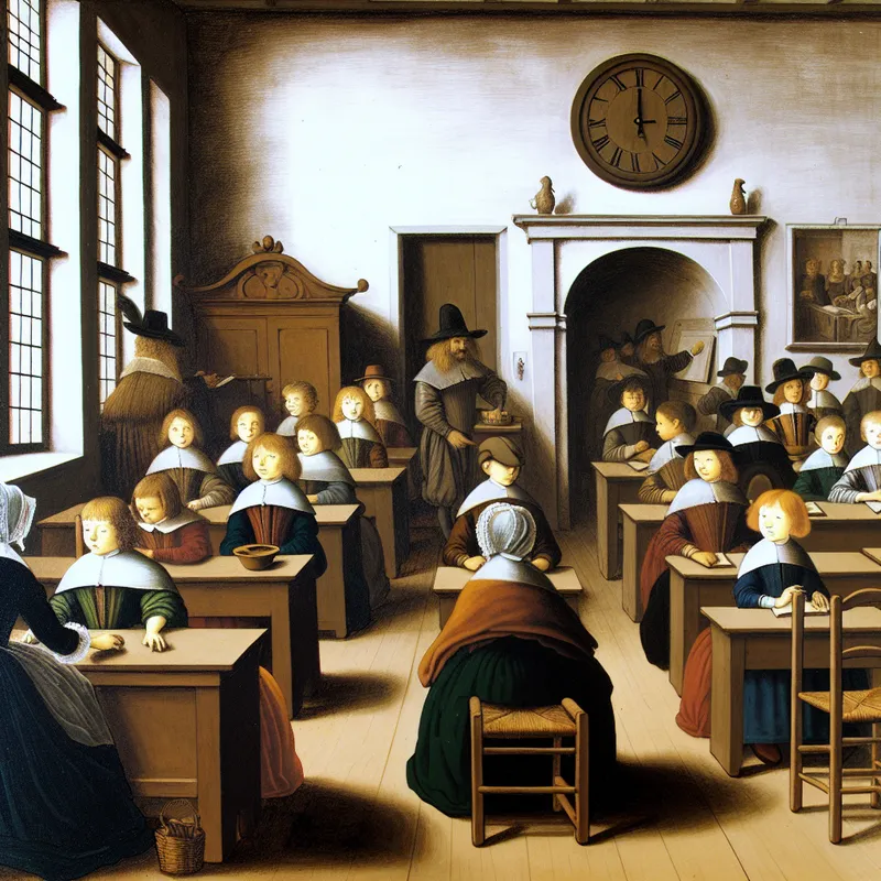 17e-eeuwse Nederlandse genrescène van een rustige schooldag met leerlingen en een leraar in een klaslokaal, geschilderd in de stijl van Gerard ter Borch