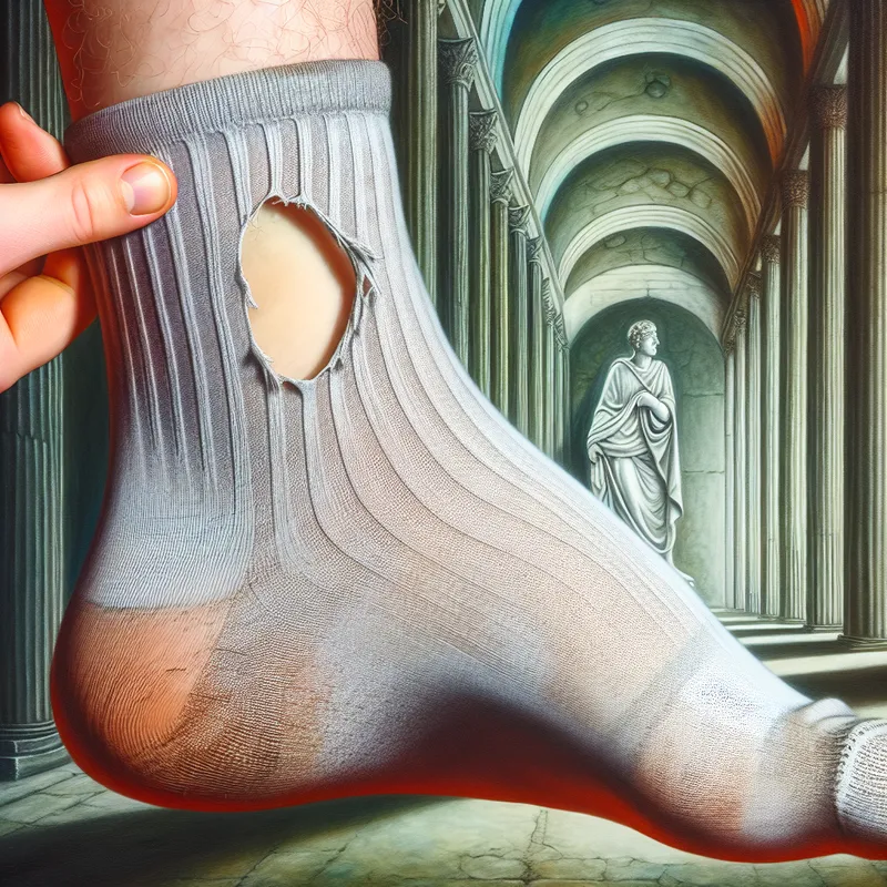 Close-up van een voet met een sok met een gat bij de grote teen, hyperrealistisch surrealistisch schilderij in de stijl van Carel Willink