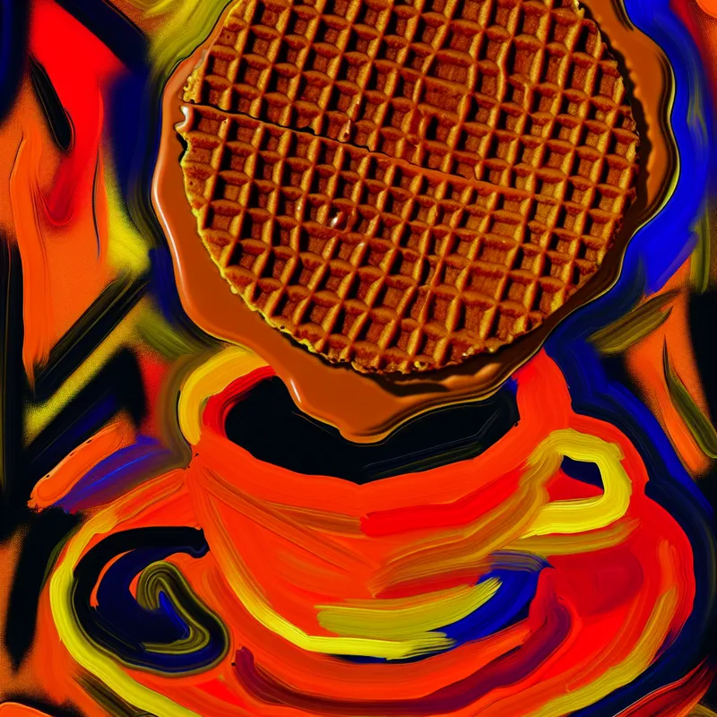 Abstracte Nederlandse scène met dampende koffie en een stroopwafel die smelt bovenop de kop, in expressieve stijl van Karel Appel