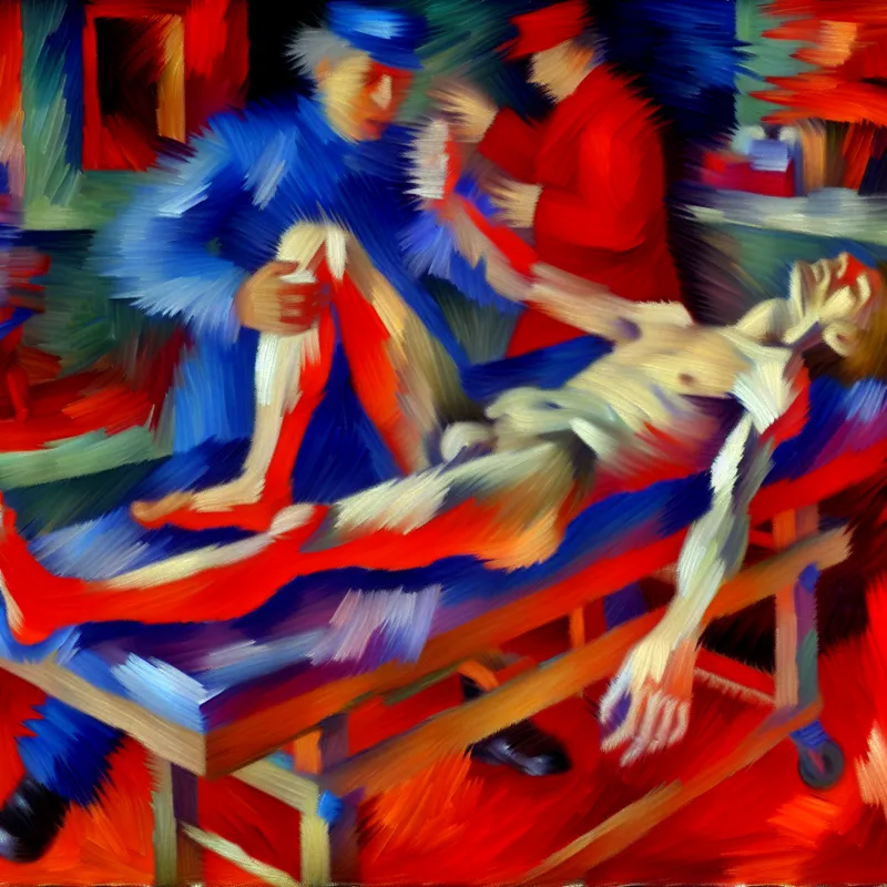 Abstract expressionistische weergave van een epileptische aanval met een figuur in convulsies, chaotische penseelstreken en urgente kleuren