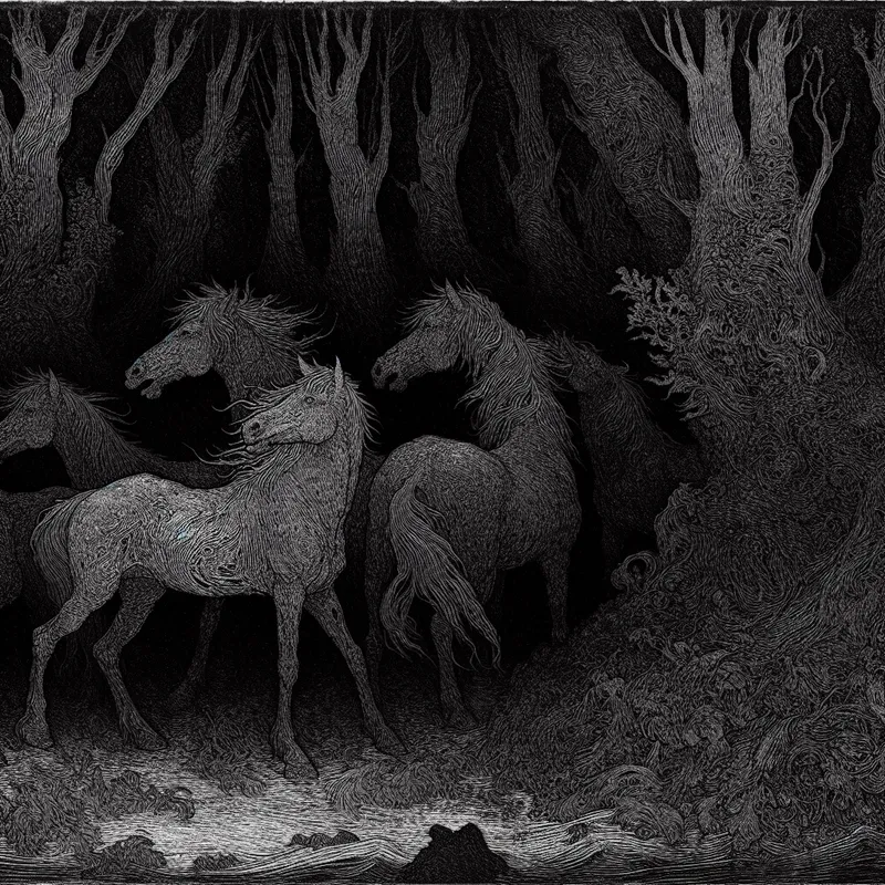 Groep wilde paarden met golvende manen in een donker, mysterieus bos, levend in vrijheid zonder menselijk contact