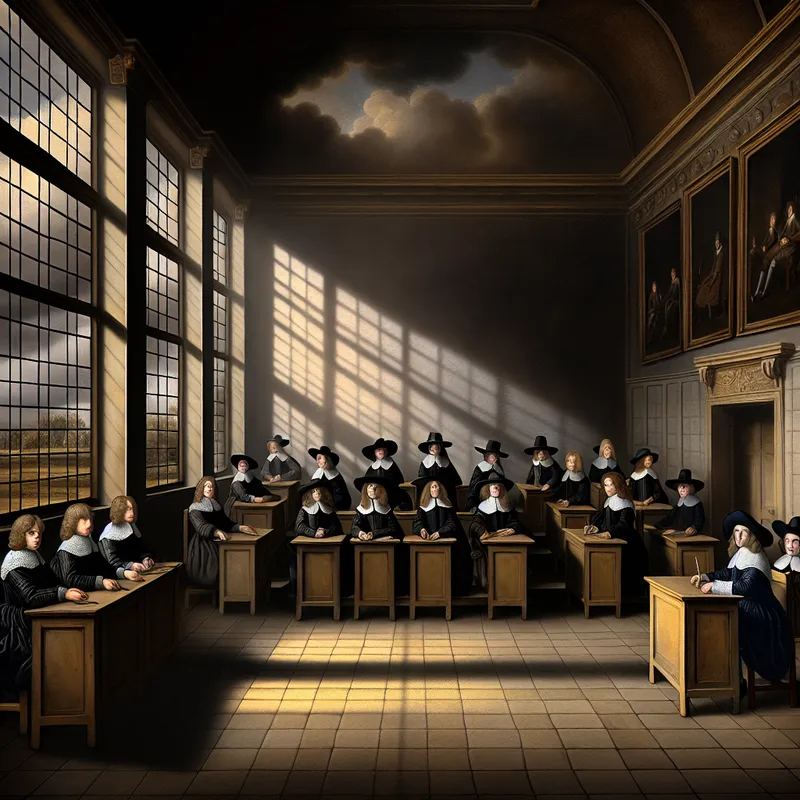 17e-eeuwse Nederlandse klas met zestien leerlingen in historische kleding, zittend aan houten banken in een klaslokaal met dramatisch licht en wolkenlucht buiten