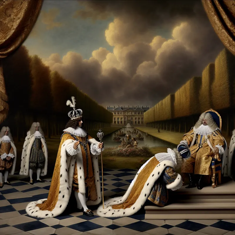 Formele koninklijke audiëntie in een weelderige paleistuin, waarbij een minister buigt voor een vorst in koninklijke gewaden, symboliserend eerbied en hiërarchie in het koningshuis