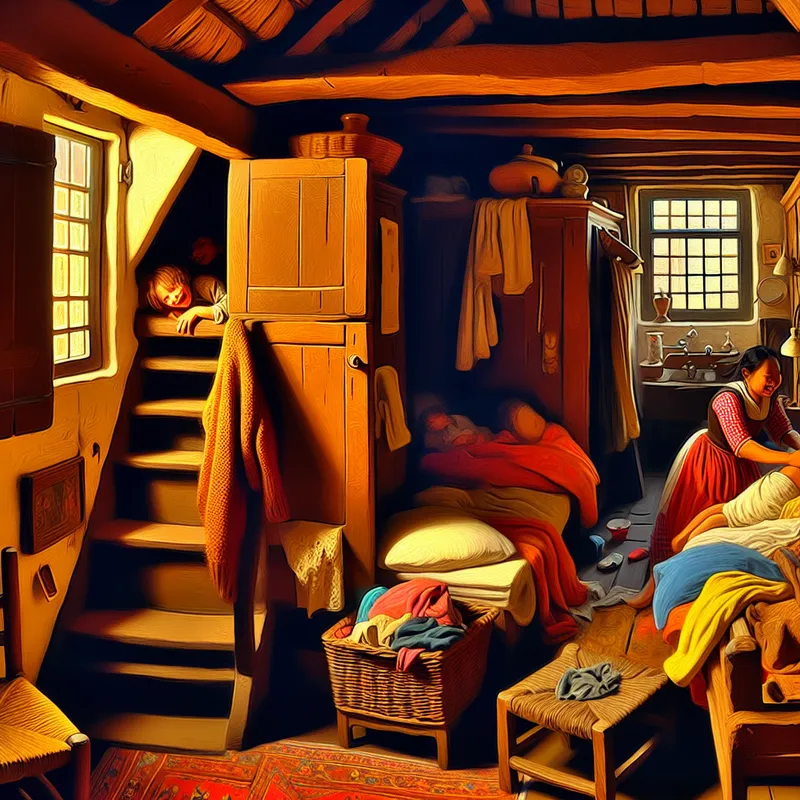 Gezellige bovenverdieping van een Nederlands huis in de stijl van Jan Steen, waar een ouder kinderen instopt terwijl zonlicht door het raam schijnt