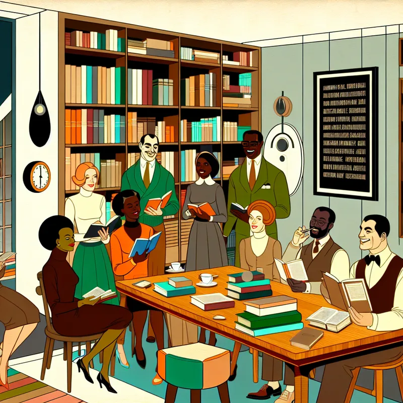 Levendige retro-futuristische illustratie van een gezellige boekenclubbijeenkomst met diverse leden die boeken bespreken in een sfeervolle ruimte met boekenplanken en warme verlichting