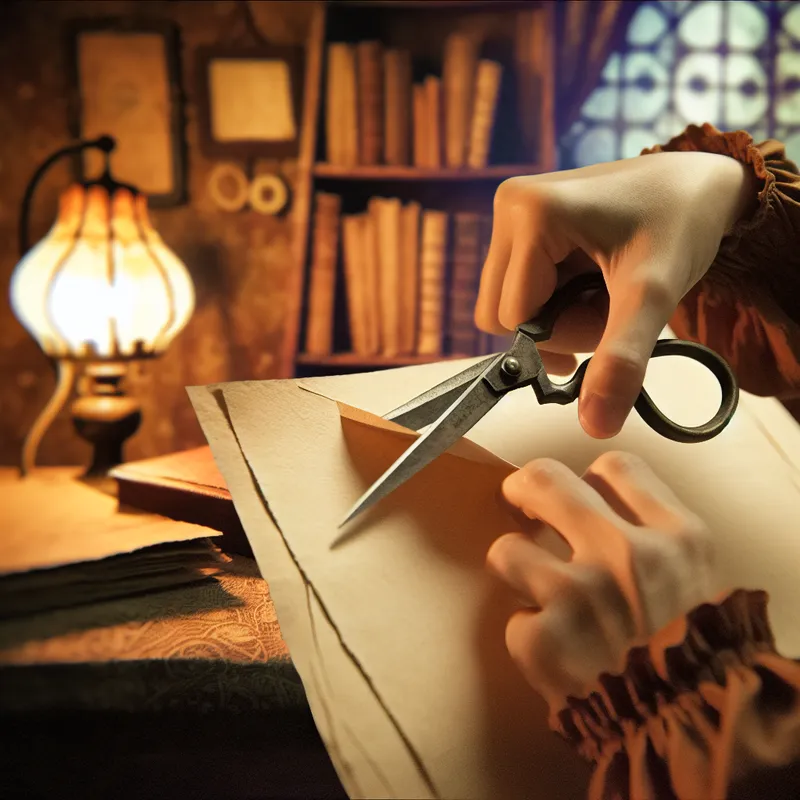 Persoon knipt zorgvuldig papier met een schaar in een nostalgische, sprookjesachtige kamer om het concept 'verwijzing' uit te beelden