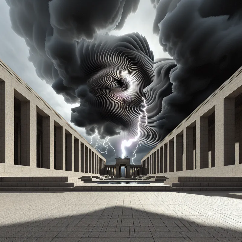 Hyperrealistisch surrealistisch tafereel van een dramatische onweersbui boven een monumentale stad, met bliksem en visuele weergave van rommelende donder als golven in de lucht