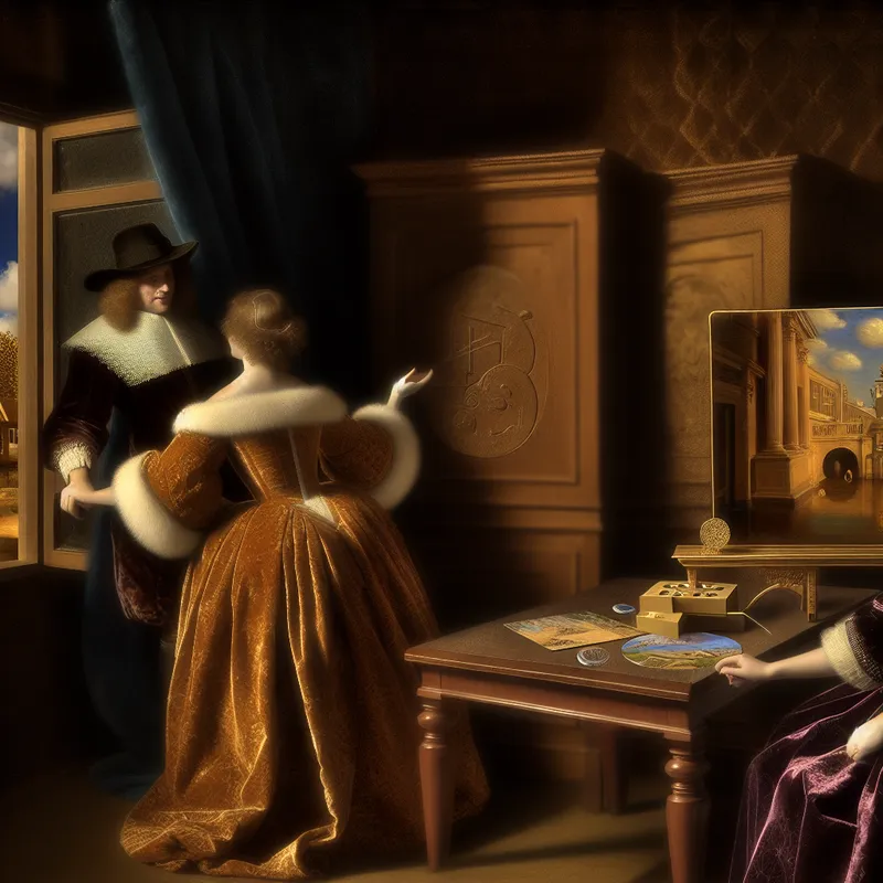 Twee elegante figuren in een 17e-eeuws Nederlands interieur bereiden zich voor op een reis richting een verre bestemming, met een dromerig landschap en concertzaal op de achtergrond