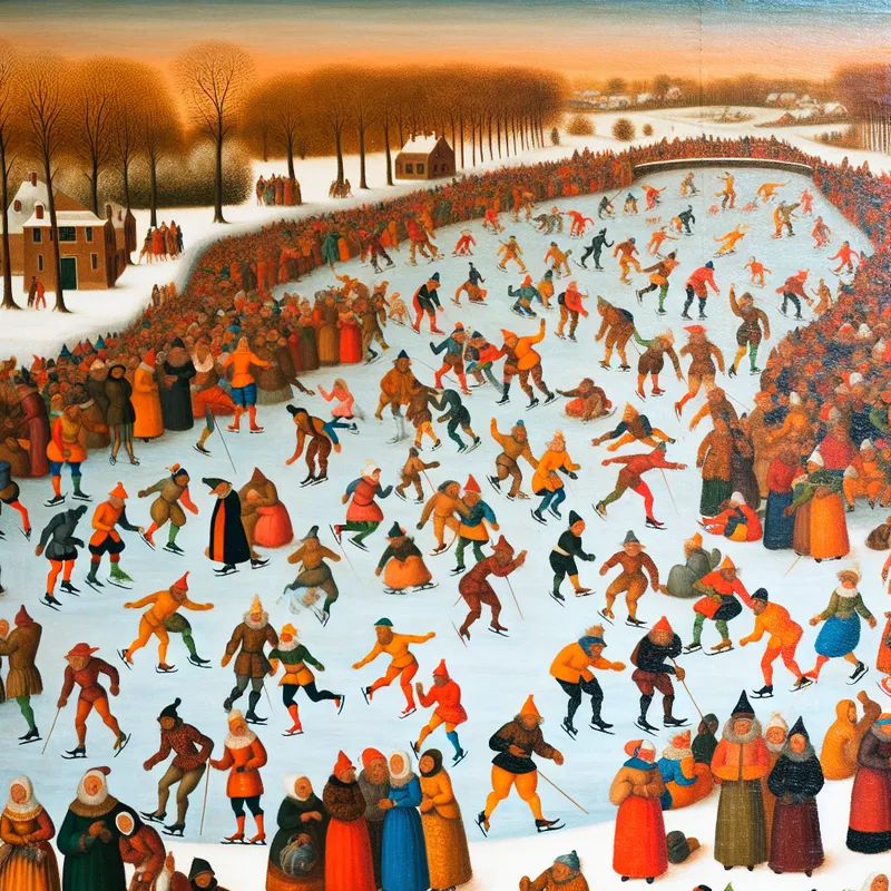 Drukbevolkte winterse ijsbaan met een heleboel schaatsende en pratende mensen in de stijl van Hendrick Avercamp