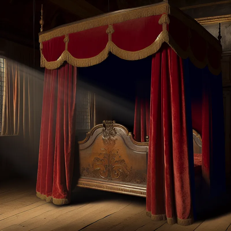 Antiek vierposter hemelbed met rode fluwelen hemel en gouden franjes in een 17e-eeuws Nederlands interieur
