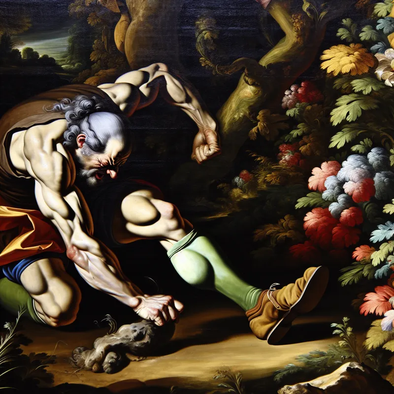 Barokke voorstelling van een gespierde man die knielt in een tuin en onkruid wiedt, met nadruk op de kniegewrichten en spierspanning in de benen