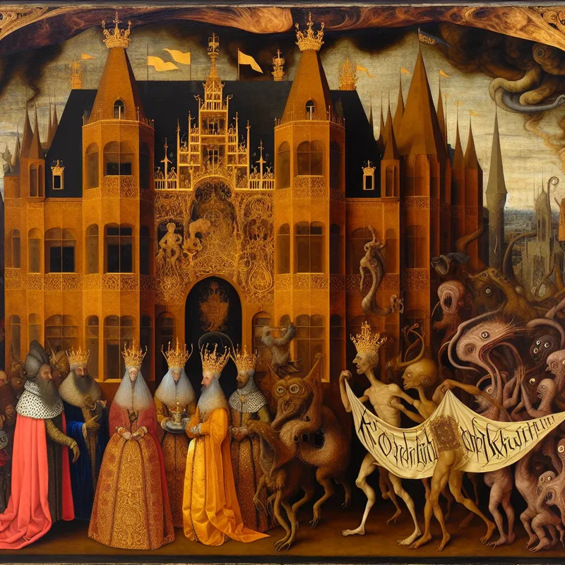 Surrealistisch schilderij in de stijl van Jheronimus Bosch van een koninklijke hofhouding in Den Haag, met het woord 'koninklijk' op een banier en hybride wezens