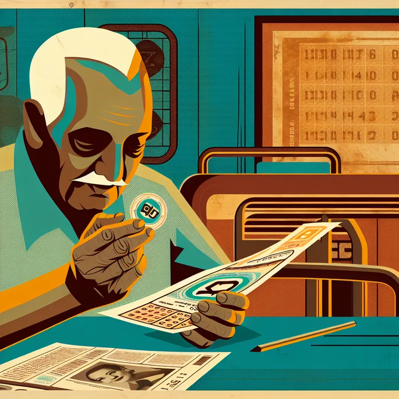 Ouderwetse illustratie van een man die een loterijbriefje vasthoudt in een nostalgische jaren 50-60 setting