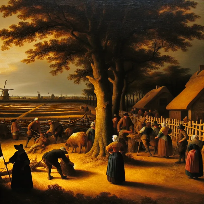 17e-eeuws Nederlands dorpsgezicht in Rembrandt-stijl met boeren die samenwerken op het gemeenschappelijke grondgebied, de mark