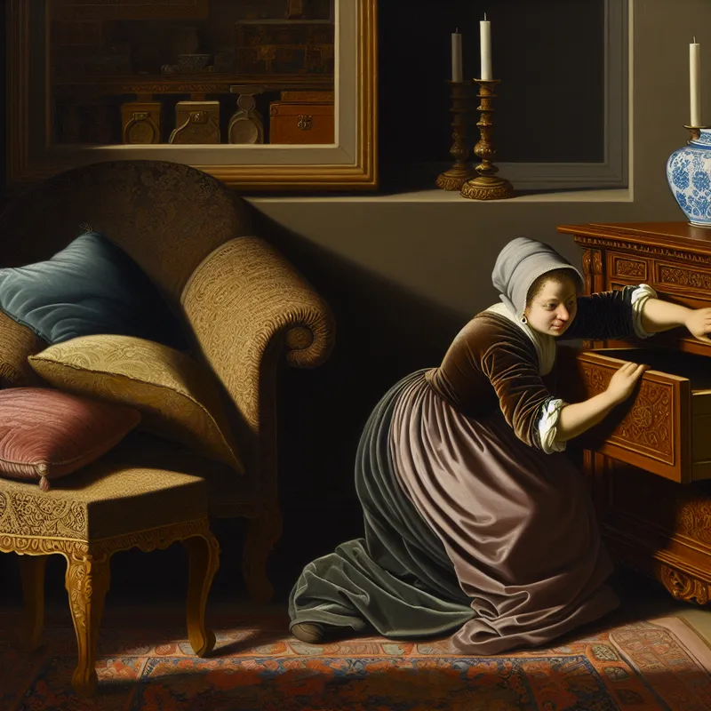 17e-eeuws tafereel van een persoon die wanhopig sleutels zoekt in een elegante Nederlandse kamer, zonder succes