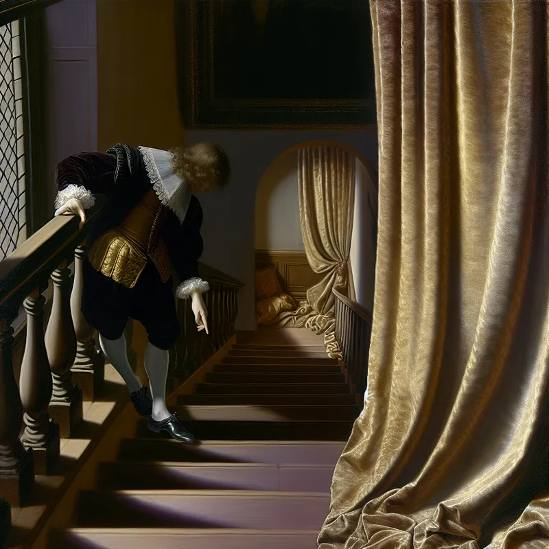 Elegant 17e-eeuws interieur met een persoon die naar beneden wijst op een grote trap, illustrerend de beweging 'omlaag'