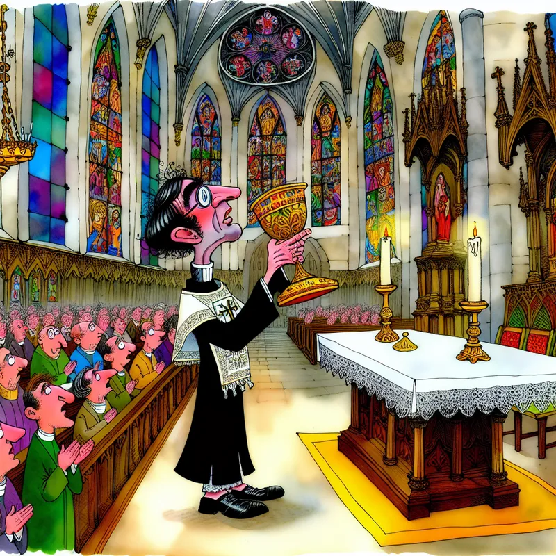 Vrolijke cartoonillustratie van een katholieke priester die de zondagsmis leidt in een rijkversierde kerk met kleurrijk licht van gebrandschilderde ramen