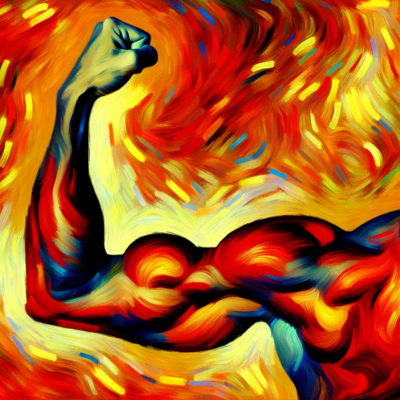 Abstract expressionistische illustratie van een menselijke arm met uitvergrote biceps, benadrukt door dynamische penseelstreken en felle kleuren, die spierspanning en beweging weergeeft